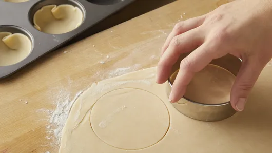 Heat oven to 425°F. Line cookie sheet with cooking parchment paper. Remove one crust from pouch. On lightly floured surface, unroll crust, and roll to 12-inch circle. With 3 1/2-inch round cutter, cut 6 rounds from crust; repeat for remaining crust. Press circles into 12 ungreased regular-size muffin cups. Reserve crust scraps for star cutouts.