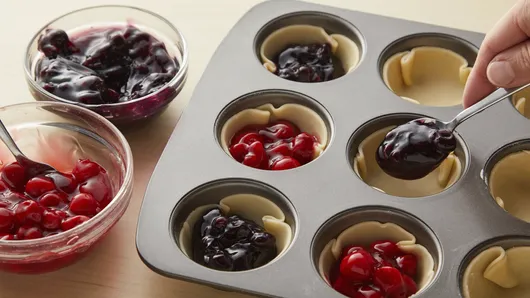 Spoon 2 generous tablespoonfuls cherry pie filling into 6 of the muffin cups. Spoon 2 generous tablespoonfuls blueberry pie filling into remaining 6 muffin cups.
