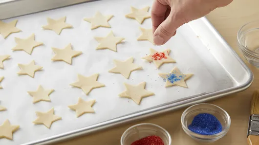 Meanwhile, use 1 1/2- to 2-inch star cookie cutters to cut 12 to 24 cutouts from remaining dough, rerolling scraps as needed. Place cutouts on cookie sheet; lightly brush with water, and sprinkle with decorating sugar.