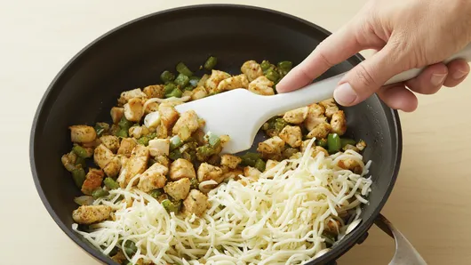 In 10-inch nonstick skillet, melt butter over medium-high heat. Stir in onion, bell pepper and chicken; cook 5 to 7 minutes, stirring occasionally, until chicken is no longer pink and vegetables are tender. Stir in 2 teaspoons of the chicken seasoning. Remove from heat; cool 5 minutes. Stir in cheese.