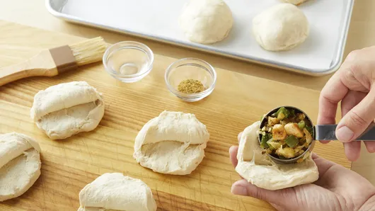Separate dough into 8 biscuits; let stand 5 minutes. Gently pull each biscuit apart partially, leaving bottom and lower sides intact, forming a deep pocket. Place 1/4 cup chicken mixture inside, pressing inside to fit. Gently stretch dough over filling, pressing and firmly sealing around edges of biscuit. Reshape into round, and place on cookie sheet. Repeat for remaining biscuits. (Biscuits will be full.) Brush tops of biscuits with water; sprinkle with remaining 1/4 teaspoon seasoning.