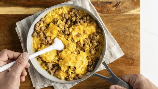 Start by scrambling up 5 eggs in a nonstick skillet, then stir in shredded cheddar cheese and savory pork sausage crumbles.