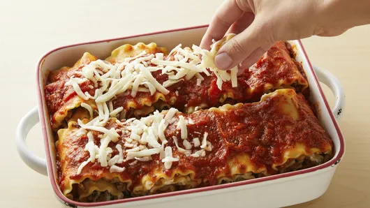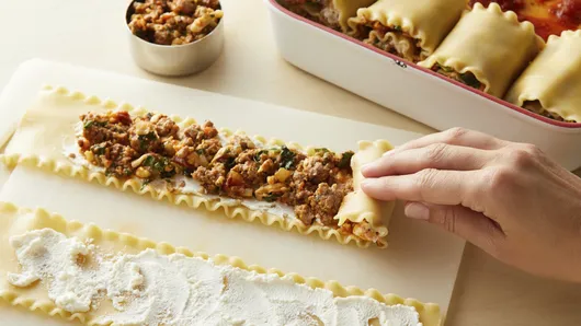 Step5To Make Ahead and Freeze: Line 15x10x1-inch pan with foil. Place unbaked rolls, seam side down, in pan; cover loosely with foil. Freeze about 1 hour or until firm. Place frozen rolls in large resealable freezer plastic bag; label. Freeze up to 3 months. To bake 8 lasagna rolls: Remove rolls from freezer; thaw in refrigerator overnight, but no longer than 24 hours. Spray 11x8-inch (2-quart) glass baking dish with cooking spray. Spread 1/2 cup pasta sauce in bottom of baking dish. Remove thawed rolls from bag; place rolls, seam side down, in baking dish. Cover with foil. Heat oven to 350°F. Pour 1 cup pasta sauce over and around rolls in baking dish. Cover tightly with foil; bake 55 to 65 minutes or until hot and bubbly. Sprinkle with 1 cup mozzarella cheese; bake uncovered 3 to 5 minutes or until cheese is melted. Let stand 5 minutes before serving.