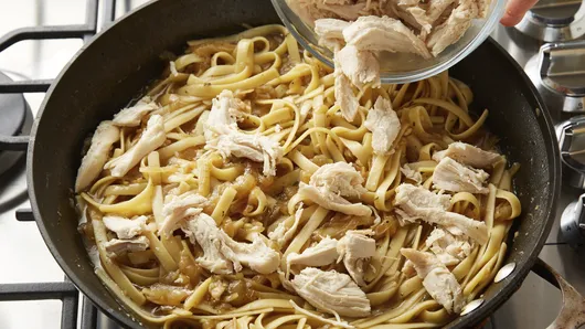 Sprinkle flour over onions in skillet; cook and stir about 1 minute. Stir in broth; heat to boiling, stirring constantly. Simmer 1 to 2 minutes or until slightly thickened. Remove from heat; stir in chicken and cooked pasta, mixing to combine.