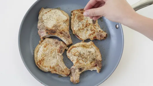 Step3Meanwhile, in 12-inch ovenproof skillet, heat remaining 1 tablespoon oil over medium-high heat until hot. Add pork chops; cook 3 to 4 minutes on each side or until lightly browned. Sprinkle with thyme, salt and pepper.