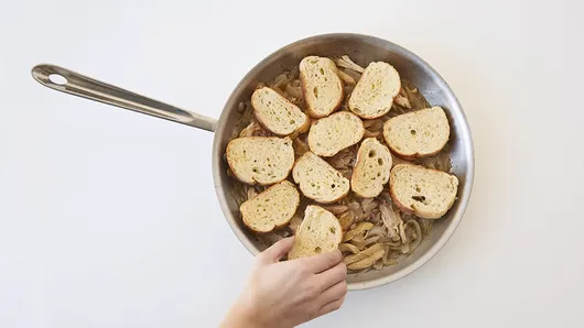 Step4Arrange bread slices in skillet on top of onion mixture; top with cheese. Bake uncovered 10 to 12 minutes or until cheese is melted. Top with remaining 1 teaspoon thyme.