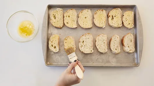 Step3Meanwhile, in small microwavable bowl, microwave remaining 1/4 cup butter uncovered on High 20 to 30 seconds or until melted; brush on both sides of bread slices. Arrange on ungreased large cookie sheet, and toast in oven 8 to 10 minutes or until slightly toasted and starting to brown; remove from oven.