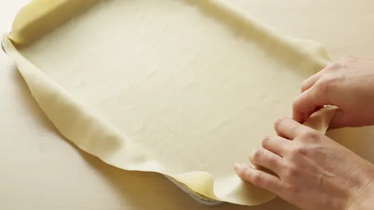 Step1Heat oven to 450°F. Remove pie crusts from pouches. On lightly floured surface, unroll and stack crusts one on top of the other. Roll to 17x12-inch rectangle. Fit crust into ungreased 15x10x1-inch pan, pressing firmly into corners and sides. Fold extra crust under, even with edges of pan. Using fork, prick all over bottom and sides.