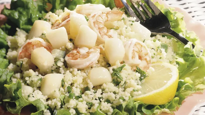 Seafood skillet dinner ready in 20 minutes! Enjoy spicy shrimp, tomatoes and olives flavored with salsa served over couscous.