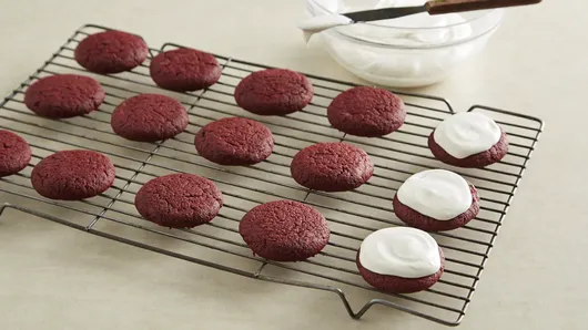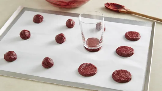 The addition of cream cheese to the sugar cookie dough gives these red velvet cookies their cakey texture.