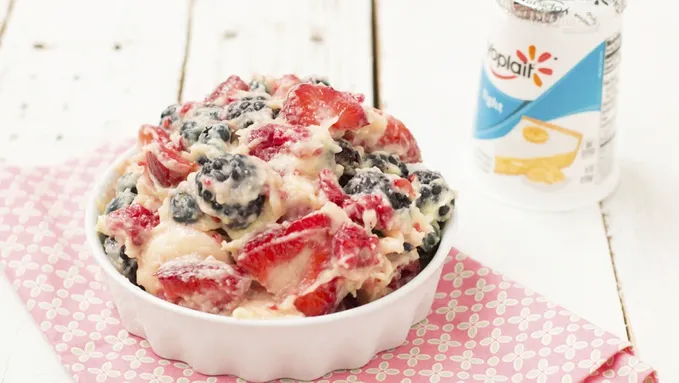 Step2In medium bowl, combine cooked macaroni and all remaining ingredients except strawberries; mix gently to coat. Cover; refrigerate 1 to 2 hours to blend flavors.