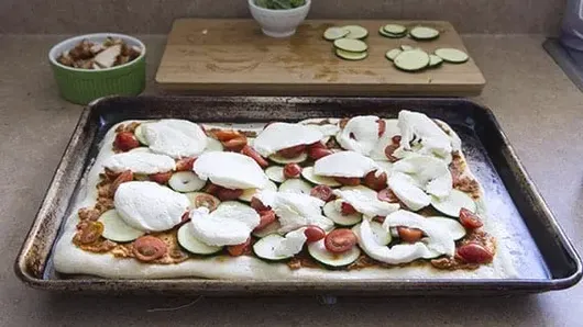 Step3Remove partially baked crust from oven. Spread pesto over crust. Layer with zucchini, tomatoes and mozzarella slices.