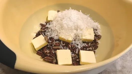 Step4In large bowl, mix 3 tablespoons unsalted butter, 1/4 teaspoon salt, 3/4 cup toasted pecans, roughly chopped, and 3/4 cup sweetened or unsweetened coconut flakes. Set aside.