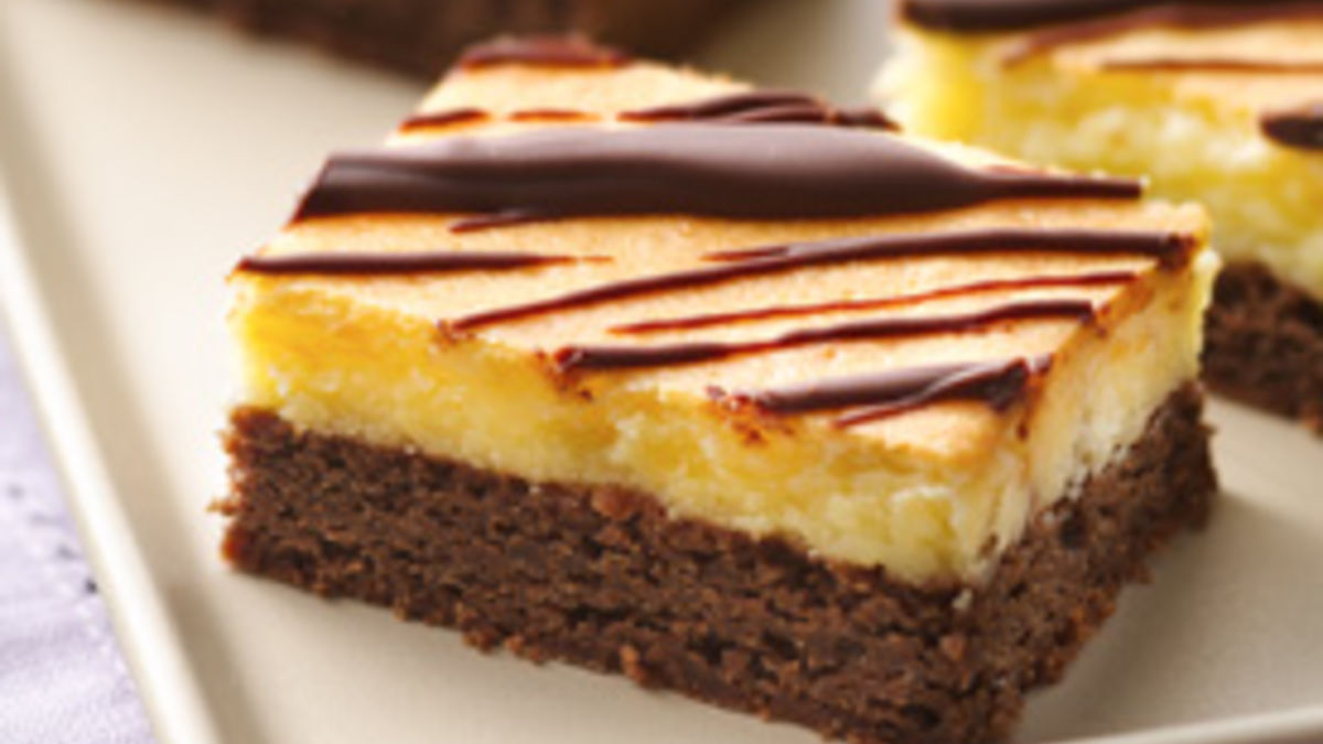 Cheesecake topping and chocolate glaze makes these brownies a perfect dessert treat.