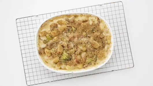 Enjoy this French-inspired cheesy casserole packed with potato gnocchi, ham and vegetables – a creamy dinner.