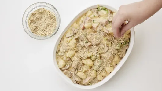 Step3Add ham, broccoli in sauce, mushrooms and cooked gnocchi; mix well. Spoon into ungreased 9-inch square (2-quart) glass baking dish. In small bowl, combine bread crumbs and remaining 1/2 cup cheese; mix well. Sprinkle over casserole.