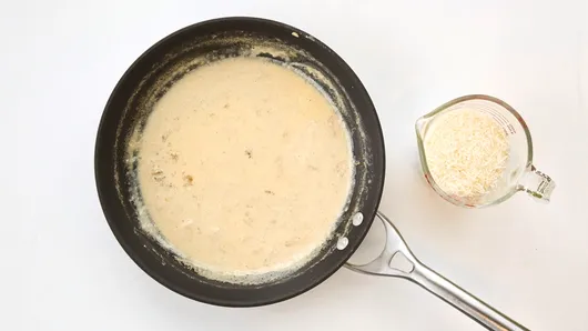 Step2Meanwhile, melt butter in large nonstick skillet over medium heat. Add garlic; cook and stir 3 minutes. Add cream; mix well. Gradually add 1 cup of the cheese, stirring after each addition until melted.