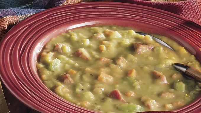 Step1In Dutch oven or large saucepan, combine all ingredients except ham. Bring to a boil over medium-high heat. Reduce heat to low; simmer 45 to 60 minutes or until peas and vegetables are very tender.