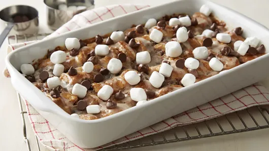 Ooey gooey cinnamon roll pull-aparts and s’mores come together in this indulgent bubble-up bake, sure to become a breakfast favorite.