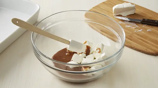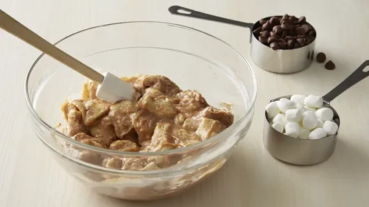 Step2Unroll dough; separate dough into pieces, and stir into cream cheese mixture. Stir in 1/2 cup of the chocolate chips and 1/2 cup of the miniature marshmallows; spoon into baking dish. Bake 23 to 25 minutes or until dough is baked through and golden brown around edges.