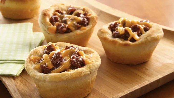 Step2Pull each biscuit apart into 2 layers; press each into 4-inch round. Place 1 round in each of 10 greased regular-size muffin cups. Firmly press in bottom and up side, forming 1/4-inch rim. Fill with beef mixture; sprinkle with cheese.