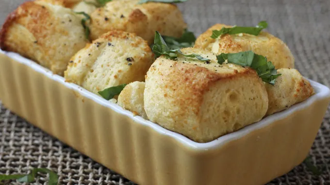 Step2In small bowl, mix melted butter, dill weed and garlic powder. Separate each can of dough into 5 biscuits; cut each biscuit into fourths. Coat half of the biscuit pieces in butter mixture; arrange in pan.