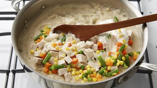 Step1Melt margarine in large heavy skillet. Add onion; cook and stir until tender. Lightly spoon flour into measuring cup; level off. Add flour and salt to skillet; stir until smooth. Add broth, water and hot pepper sauce; cook until bubbly and thickened, stirring constantly. Stir in chicken, mixed vegetables and sour cream. Simmer over low heat until thoroughly heated.