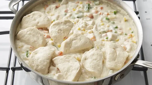 Step2Separate dough into 8 biscuits; cut each in half. Place biscuit halves on top of hot chicken mixture. Simmer, uncovered, 10 minutes.