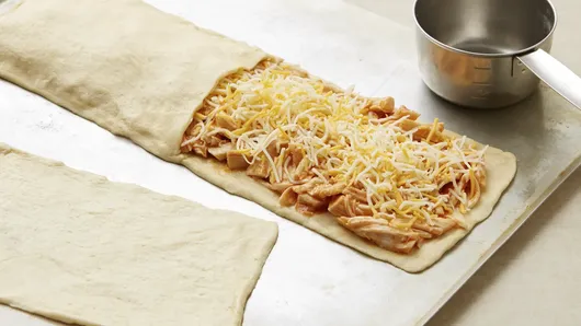 Step2In medium bowl, mix chicken and sauce. Spoon chicken mixture lengthwise in 4-inch strip down center of dough to within 1/4 inch of edges. Top with cheese. Press remaining 2 rectangles to 7x5 inches, firmly pressing perforations to seal. Place each rectangle over cheese, pinching center seam to seal.