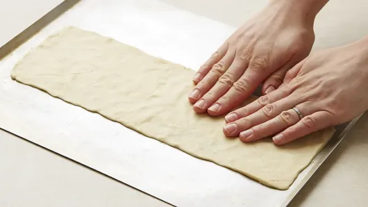 Step1Heat oven to 375°F. Separate dough into 4 rectangles. Onto ungreased cookie sheet, place 2 rectangles, short ends together, forming 14x5-inch rectangle. Firmly press perforations and center seam to seal.