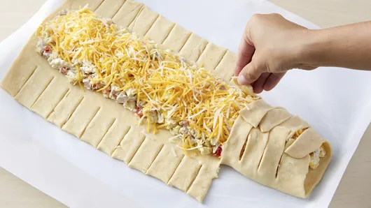 Spoon egg mixture in 4-inch wide strip lengthwise down center of rectangle. Sprinkle with shredded cheese. With sharp knife, make cuts 1 inch apart on long sides of dough rectangle to within 1/2 inch of egg mixture. Fold strips of dough up over egg mixture to meet in center; pinch to seal.