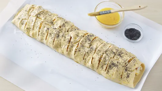 In small bowl, beat remaining egg with whisk or fork; brush evenly onto dough. Sprinkle with poppy seed.