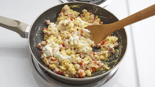 In 10-inch nonstick skillet, melt butter over medium-high heat. Pour egg mixture in skillet; cook over medium-high heat 2 to 3 minutes or until eggs are thoroughly cooked but still moist. Stir in cream cheese. Cook 1 to 2 minutes longer, stirring occasionally, until cheese is melted.