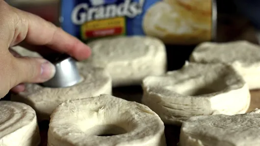 Step3Place paper towels under cooling rack. Separate dough into 8 biscuits. Using small round cookie cutter, cut hole in center of each biscuit.