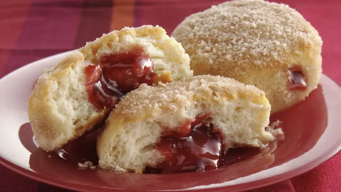 Step1Heat oven to 375°F. Separate dough into 5 biscuits. Dip tops and sides of each biscuit in butter; dip in 1/4 cup sugar. Place on ungreased cookie sheet. Bake 13 to 17 minutes or until golden brown. Cool 5 minutes.