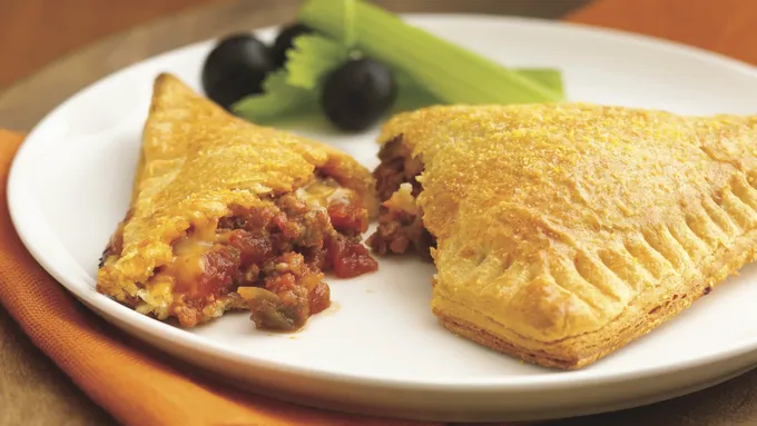 Step2Press each biscuit into 6-inch round. Spoon 1/3 cup meat mixture and about 1 tablespoon cheese onto center of each round. Fold dough in half over filling; press to seal. Place on ungreased cookie sheet.