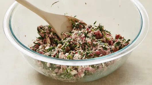 Step2Meanwhile, in large bowl, mix lamb, Italian seasoning, onion powder, 1/2 teaspoon fine sea salt and 1/4 teaspoon pepper. Add spinach and feta cheese; mix with spoon or hands until well blended.