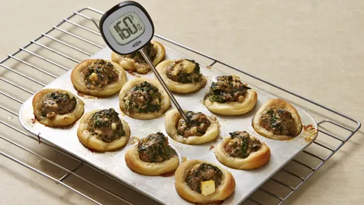Step1Heat oven to 400°F. Spray 36 mini muffin cups with cooking spray. Microwave frozen spinach as directed on box 3 to 4 minutes to thaw. Drain well; squeeze dry with paper towels.