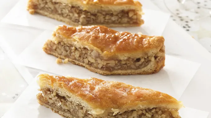 A honey-lemon syrup is poured over this nutty pie after baking, creating a new twist on baklava.