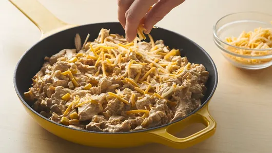 Step2Add chicken, sweet corn, green chiles and 1 cup of the Mexican cheese blend, stirring to combine. Transfer mixture to skillet, and top with remaining 1/2 cup Mexican cheese blend.