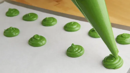 Step2In large bowl, break up cookie dough. Add eggs, flour and green food color. (DO NOT EAT RAW COOKIE DOUGH AFTER COMBINING WITH FLOUR AND EGGS.) Beat with electric mixer on medium speed about 30 seconds or until well blended. Place mixture in decorating bag fitted with tip, or place in resealable plastic food-storage bag and cut off 1 corner. Pipe batter into 1 1/4-inch circles 1 inch apart on cookie sheets.