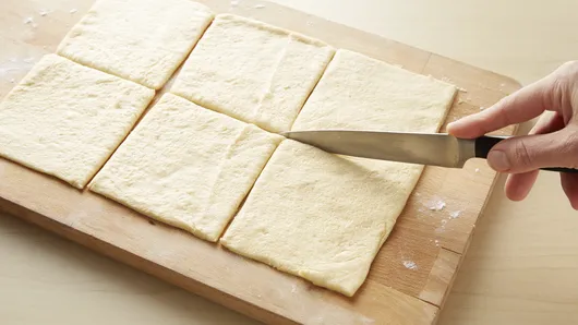 Step2Unroll dough sheet on work surface; reshape into 12x8-inch rectangle. With pizza cutter or sharp knife, cut dough sheet into 6 squares, 4x4 inches each.