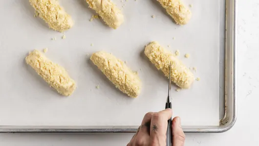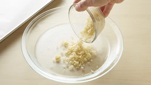 Step1Heat oven to 375°F. Line large cookie sheet with cooking parchment paper. In small microwavable bowl, microwave butter and garlic powder uncovered on High 20 to 30 seconds or until butter is melted. Stir in bread crumbs; transfer to pie plate or shallow dish.
