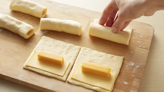 Step3Place 1 cheese slice half and 1 cheese stick half onto 1 end of each square near center. For each roll-up, roll side with cheese, rolling to opposite side, and pinching seam to secure. Continue for remaining roll-ups.
