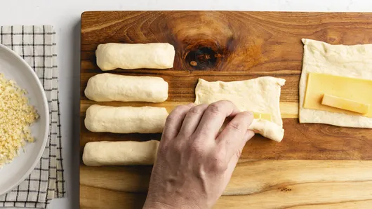 Layer a slice of American cheese and a stick of cheddar cheese on each piece of dough, then roll each one up snugly, pinching the edges together to seal. Make sure they’re sealed firmly; otherwise, the cheese will melt out!