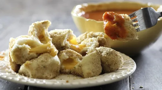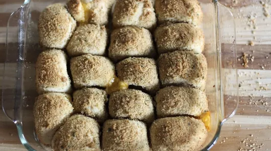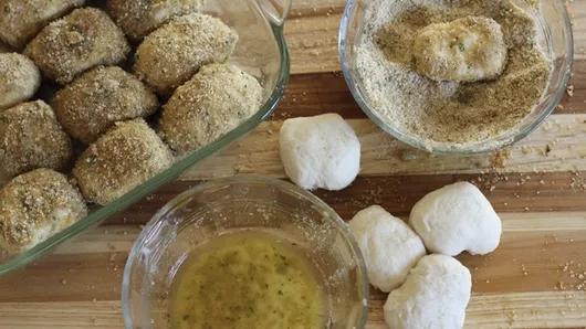 Step3Quickly dip each dough-wrapped cheese into melted butter; very lightly coat with bread crumbs. (Do not use too many bread crumbs, just enough for a little texture and flavor.) Place wrapped cheese in 3 rows in pan.
