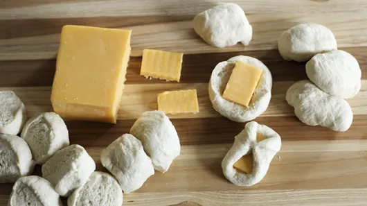 Step2Remove dough from can. Cut into 18 half-inch-thick slices. Gently stretch and flatten each dough slice; wrap dough around 1 piece of cheese, making sure to seal cheese completely inside dough. Repeat with each piece of cheese and slice of dough.