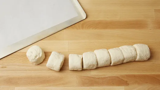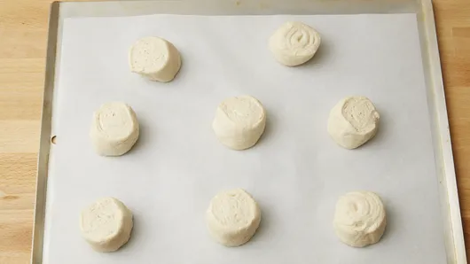 Step1Heat oven to 350°F. Remove dough from can. Cut crosswise into 8 pieces. Place pieces, cut side down, on ungreased cookie sheet. Bake 16 to 18 minutes or until golden brown. Cool 10 minutes.