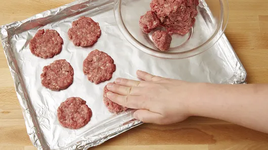 Step2Meanwhile, in medium bowl, mix beef, Worcestershire sauce, salt and pepper. Shape mixture into 16 balls. Flatten each ball into patty about 2 3/4 inches in diameter.