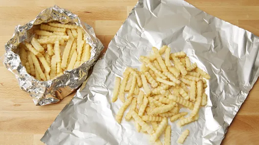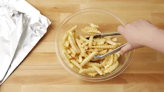 Step2Tear off 2 (12-inch) lengths of Reynolds Wrap® Heavy Duty Foil to make foil boats. Place half of the fries in a single layer in the center of 1 piece of foil. Loosely fold foil around edges to form a boat, leaving large hole at top to allow steam to escape; repeat with remaining fries and foil.
